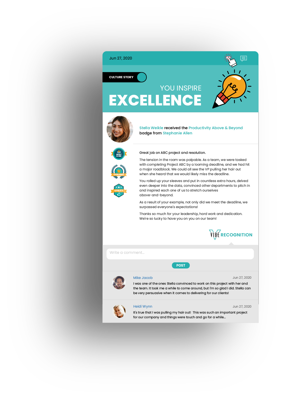 VIBE RECOGNITION Builder guides your employees through the quick steps that will transform a simple recognition message into a story that sticks, connects and inspires.